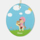 Este ornamento cerâmico redondo tem uma menina marrom bonito do cabelo com as tranças que montam em um cavalo dos desenhos animados em um campo das flores. Há nuvens inchado brancas no céu com o sol que espreita para fora da uma nuvem de trás. Isto pode facilmente ser personalizado com um nome na parte inferior. Gráficos pelo design de Zenware em Mygrafico
