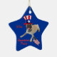 Este ornamento caracteriza um Pug que veste um chapéu vermelho, branco e azul patriótico. O texto customizável é texto existente disponível ou da supressão.