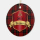 O ornamento cerâmico colorido de xadrez, com o padrão tradicional de xadrez de tartan MacQueen, de cor vermelha, preta e amarela, como fundo. Gráficos de um escudo vermelho e dourado como placa, tem texto preto personalizado pronto para personalizar. ornamento familiar de herança de excelente. Faz um enfeite e decoração de presente de excelente para outros usos na casa.