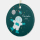 Este menino bonito personalizado em volta do ornamento cerâmico tem fora deste tema do espaço do mundo! O fundo tem uma cor escura da cerceta com lotes de estrelas amarelas, brancas, e cinzentas no fundo. Há um astronauta na parte inferior com uma lua cinzenta com uma bandeira da estrela na parte superior. Há um navio do foguete que flutua à direita da lua. À direita, você pode facilmente personalizar o nome e o ano.