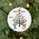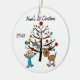 Uma cerâmica redonda bonito guardando o enfeite de Natal apresenta um boneco de palitos em um dorminhoco azul em frente à árvore de Natal decorada com um gato familiar na árvore, um cachorro e áreas onde você pode adicionar texto incluindo o ano atual e o nome da criança. Este é um presente adorável para qualquer bebê celebrando seu primeiro Natal!