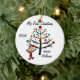 Um ornamento cerâmico redondo bonito do feriado do Natal da lembrança caracteriza uma figura menina da vara em um dorminhoco vermelho na frente da árvore e das áreas decoradas de Natal onde você pode adicionar o texto que inclui o nome do ano em curso e da criança. Este é um presente adorável para todo o bebé que comemora seu primeiro Natal!