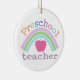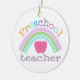 Este ornamento personalizado faz um grande presente para professores prées-escolar. A parte dianteira lê "o professor pré-escolar" com um arco-íris e uma maçã. A parte traseira pode ser personalizada com seus mensagem e nomes do feriado.