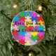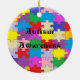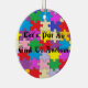 Colorido Vibrantly em volta do ornamento do feriado decked com fundo da parte do quebra-cabeça. Um lado lê "deixou-nos pôr uma extremidade ao autismo" quando o outro indicar simplesmente do "a consciência autismo". O *** QUE TODOS OS DIREITOS SERÃO DOADOS AO AUTISMO FALA O ***