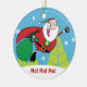 Este adorável ornamento de árvore de Natal em cerâmica apresenta Super Papais noeis vestindo sua capa e carregando um grande saco de presentes e a legenda "Ho! Ho! Ho!"