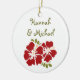 Nossos ornamento vermelhos e verdes bonito do favor do casamento do hibiscus são perfeitos para um luau havaiano ou um casamento temático ou um chá de panela da praia tropical. As flores vermelhas com um pólen amarelo aglomeram-se e a samambaia do verde sae. Este o costume e os ornamento personalizados fazem casais bonitos chá para favorecer ou lembrança e presente para que os noivos sejam. © Chrissy H. Estúdio dos trabalhos de arte, LLC. Todos os direitos reservados.