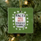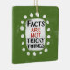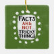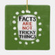 O texto negrito que lê "Fatos não são coisas complicadas" é centrado sobre um fundo verde. O texto preto e laranja escuro se senta em um retângulo branco com grandes pontos brancos texturizados ao seu redor, fornecendo um contraste lúcido contra o pano de fundo de cor sólida.