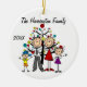 Um ornamento cerâmico redondo bonito do feriado do Natal da lembrança caracteriza uma figura pai, mamã, menino pequeno em um boné azul da bola, e uma menina da vara em um vestido roxo na frente da árvore e das áreas decoradas de Natal onde você pode adicionar o texto que inclui o nome do ano em curso e de família. Este é um presente adorável para que toda a família comemore o ano!
