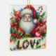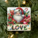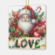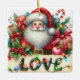 Na frente deste ornamento cerâmico de manutenção para uma criança está o retrato de Papai Noel em seu clássico terno vermelho de Feriado e chapéu. Ele está rodeado de presentes coloridos, decorações e uma cana doce. Na frente dele está um cartaz que diz "AMOR" com luzes decorativas amarradas nele. O verso do ornamento tem uma mensagem de Feliz Natal, o nome do seu filho e a sua assinatura. Perfeito para uma filha, filho, neta ou neto.