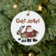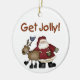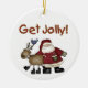 O ornamento de guardas de Férias, com Papais noeis e uma das renas, e texto que diz "Get Jolly!".