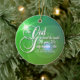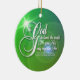 Capitulação bonita da escritura, John3: 16. Roteiro branco sobre verde e azul, com cruz da estrela de ardência. Feliz Natal na parte traseira, com texto customizável. Espalhe uma palavra pequena ao redor.