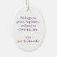 Decoração festiva do Natal do anjo. Ornamento da lembrança a pendurar em sua árvore. A mensagem simples no reverso lê o "desejo lhe da paz, felicidade e a alegria este amor do tempo do Natal a seguir adiciona seus nomes. Projetado excepcionalmente por Sarah Trett.