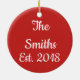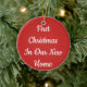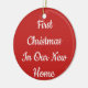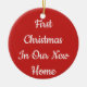 Vermelho clássico e ornamento customizável do White Christmas com "primeiro Natal em nossa casa nova" na parte dianteira e "no est dos ____. 2018" na parte traseira