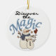 Snowman mantém o ornamento de férias com o texto que diz "Descubra a Magia"!