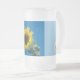 Grande girassol amarelo contra o brilhante céu azul, flanqueado por painéis opacos menores de girassóis solteiros.
