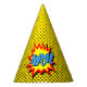 O chapéu amarelo e preto do partido das bolinhas caracteriza o gráfico da arte da palavra de Kapow. Fácil montar. Este teste padrão de ponto coordena com coleção do partido do super-herói em nossa loja assim como a maioria de festas de aniversário temáticos do super-herói. Também disponível em nossa loja sem o gráfico de Kapow.