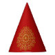 Chapéu elegante de papel vermelho e ouro. Ideal para ocasiões festivas especiais. Fundo vermelho com um ornamento inspirado em árabe ouro no estilo moderno. Abstrato, ilustração, elegante, geométrica, moderna, étnica, barroca, luxo, árabe, muçulmano, motivo.