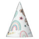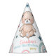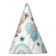 O Chapéu do Partido primeiro aniversario é decorado com um ursinho fofo, balões e um arco-íris.