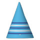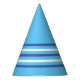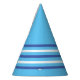 Sombras de um chapéu azul de festa com listras azuis escuras e brancas no pano de fundo azul de ovo de um robô para o aniversário de um menino ou um novo chá de fraldas de menino. Simples chapéu de cone de papel azul.