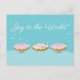 Cartão postal que mostra rosquinhas sorridentes. Todas as três rosquinhas são foscos e decoradas com aspersores. Mas, desde que o Natal está chegando, a rosquinha no meio levou para o próximo nível. É decorada em borrifadas vermelhas, verdes, brancas e luzes de Natal para celebrar o feriado. As outras duas rosquinhas estão muito impressionadas. Eu acho que você está vendo o início de uma nova tendência de moda rosquinha! A frase "Joy to the World" pode ser personalizada como quiser.