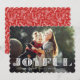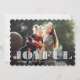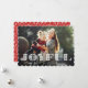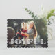 O cartão com fotos festivo e alegre do feriado caracteriza seu horizontal favorito ou ajardina a imagem orientada com o "alegre" coberta na rotulação branca do estilo do picado do papel. Personalize com seu cumprimento feito sob encomenda do Natal abaixo. Os cartões invertem a um teste padrão botânico invernal no branco no vermelho. Nós sugerimos o estilo de papel dado forma scallop para complementar o olhar do entalhe da rotulação "alegre".