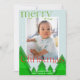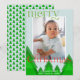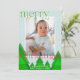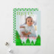 Simples cartão de Natal moderno com uma fotografia de solteiro enquadrada numa fronteira branca num fundo azul-claro de gelo. Uma floresta de árvores geométricas com tons de verde misturados adiciona um detalhe único. Um "Natal alegre" verde e vermelho brilhante, em caracteres moldados, com alguns florescimentos festivos. Personalize com uma breve mensagem e seus nomes, e o ano. A parte traseira do cartão apresenta um padrão de árvore em um esquema de cores correspondente.