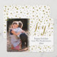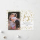 Adicione sua imagem vertical da orientação, para um cartão da folha de prova da foto com confetes impressos da faísca do brilho do ouro. Protecção branca adicionada automaticamente para um cartão de Natal moderno completo da foto para a família ou a qualquer um dos miúdos. A parte traseira caracteriza um teste padrão salpicado da faísca do ouro.