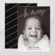 Mensagem simples de feriado "seja feliz" em uma camada de papel de cobre. Personalize com sua própria foto e mensagem de Natal. A parte traseira apresenta um padrão de tiras de folhas de cobre. A camada branca na parte inferior pode ser limpa se sua foto não precisar dela e a cor do texto pode ser alterada de preto usando a ferramenta personalizar.