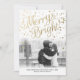 Personalize este cartão liso dos cartões de natal verticais modernos, à moda, bonitos projetado com a feliz do texto do ouro do falso e brilhante com confetes no branco. Note por favor que o ouro é impressão de cor e não é uma folha de ouro real. Substitua a imagem do modelo com sua foto horizontal favorita e mude toda a informação do modelo com seus próprios. crédito do modelo do *Photo: O selo postal de harmonização de Aimee Custis do © pode ser encontrado aqui: