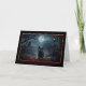 Este cartão de Halloween apresenta uma cena sombria e atmosférica ambientada em uma rua de paralelepípedos enevoada em uma cidadezinha pitoresca e antiga. O ponto focal do cartão é um gato preto elegante com olhos amarelos brilhantes, sentado calmamente no meio da rua. O olhar penetrante do gato e sua presença misteriosa adicionam um clima sinistro à cena, explorando a associação clássica do Halloween de gatos pretos com superstição.