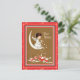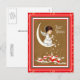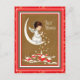 Natais vintages anjo bonitos. Sentado numa lua crescente, estrelas aspergindo numa aldeia.