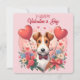 Cartão do dia dos namorados com um Fox Terrier com flores e balões em forma de coração.