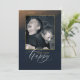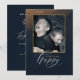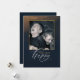 Seus amigos e familiares vão adorar receber este cartão de Ano Novo. O design incorpora tons de safira da meia-noite e dourado e pode ser personalizado adicionando sua foto favorita e os nomes dos membros da família.