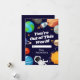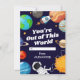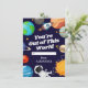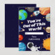 Cartão de dia de os namorados para crianças personalizadas com um fundo de céu estrelado, planetas do sistema solar espalhados pela borda, um foguete, astronauta, o ditado bonito "Você está fora deste mundo", um espaço para seu filho escrever quem é, e seu nome.