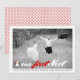 Cartão com fotos plano de Natal moderno, com a frase "Nosso primeiro Noel" em vermelho e branco, um pequeno pinguim e sua foto. O verso inclui um padrão vermelho e branco.