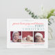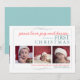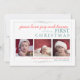 A mensagem de feriado diz "paciência amor, alegria e beijos, é o primeiro natal do bebê" neste design muito doce que mostra três fotos do seu adorável bebê. Em coral e chato sobre um fundo branco nítido, é brincalhão, divertido e torna a imagem do seu filho o ponto focal.
