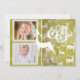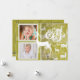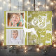 A bela safra inspirou cartões com fotos de férias com renas brancas em um fundo verde mostarda com flocos de neve movidos, texto que lê Alegria, e áreas que você pode facilmente personalizar com duas fotos, seus nomes e o ano atual. Fotografia © Storytree Studios, Stanford, CA