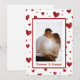 "Comemore o seu amor neste Dia dos Namorados com um cartão de foto lindamente personalizável! Basta adicionar a sua foto favorita de você e da pessoa especial, e deixar que o cartão faça o resto. O design apresenta um fundo charmoso repleto de pequenos corações vermelhos, dando-lhe um toque romântico e de coração.