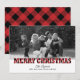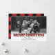 "Boas festas" o cartão com fotos moderno inclui um grande texto do espaço e do preto da foto que possa ser personalizado. Caracteriza um vermelho rústico e o teste padrão da xadrez do búfalo preto na parte dianteira e nos versos do cartão com falso neva e filtro preto e branco. <i>Estúdios de Storytree do © da fotografia, Stanford, CA</i>