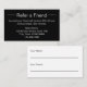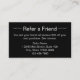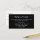 Este cartão de referência preto-e-branco tem um modelo de texto que pode editar para promover a sua empresa. Como mostrado, diz "Refer um Amigo na frente". Em seguida, há um texto para mostrar os termos da sua oferta, o seu nome comercial, endereço e número de telefone. A parte de trás tem linhas para seu cliente escrever seu nome e para sua amiga escrever seu nome.