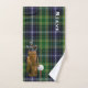 Toalha de golfe da xadrez de Tartan feita com o padrão azul, verde, amarelo e branco do clã escocês MacKellar tartan. Gráficos de um saco de golfe marrom com paus, decora um canto e o texto branco personalizado decora o canto oposto. Personalize o nome para si mesmo ou como uma ideia de presente de excelente para o seu golfista favorito.
