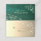 Um cartão de casamento verde de madeira rustica com renda floral de ouro e luzes de cordas.
