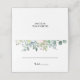 Este cartão de casamento de eucalipto tropical é perfeito para um casamento de destino. A design apresenta rosas roxas, brancas, azuis e cor-de-rosa deslumbrantes aninhados num belo buquê de folhas verdes de eucalipto. Personalize a parte de trás do cartão de lugar com os nomes da noiva e do noivo e a data.