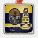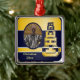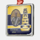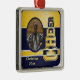 Grandes enfeites de natal cheerleading para o cheerleader que você conhece. Caracterizam um teste padrão listrado azul e amarelo com um espaço para uma fotografia na esquerda e no elogio da palavra à direita. Você personaliza o texto na parte inferior.