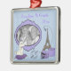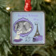 Um quadro roxo destacado pela Torre Eiffel, um par de saltos altos pretos a cair de uma caixa de chapéu vintage, um selo postal e um poodle branco sobre um travesseiro roxo são a peça central deste adorno elegante desenho de fotos de keepsasasakr. Carregue sua própria foto e personalize o ano e o nome. Este elegante design faz um presente de excelente para qualquer ocasião!