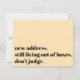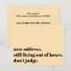 Neste cartão irônico, uma fonte ousada foi usada para renderizar "novo endereço. ainda vivendo de caixas. não julgue." na frente. Detalhes atualizados, juntamente com um amigável "Keep in Touch!" aparecem no verso. Todas as fontes, cores e texto podem ser alterados de acordo com suas próprias necessidades.