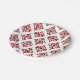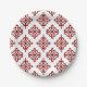 Prato redondo com fundo branco, apresentando um padrão ornamental vermelho repetitivo. O design se assemelha a floreios abstratos e simétricos. O tom é elegante e clássico.