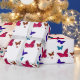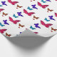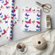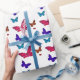 Borboletas dançantes coloridas em vermelho, azul, verde e amarelo em papel de presente embrulho branco.