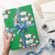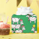 Este brinde de presente de feriado apresenta cabras desenhadas à mão em Santa chapéus empilhadas umas sobre as outras com uma estrela dourada no topo, num fundo verde.