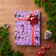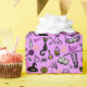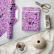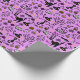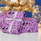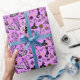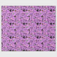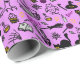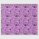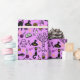 Papel embrulhando com um moderno design minimalista para o Halloween, um padrão de silhuetas de vassoura, coruja, teia de aranha, silhueta de gato, bruxa sobre fundo rosa.